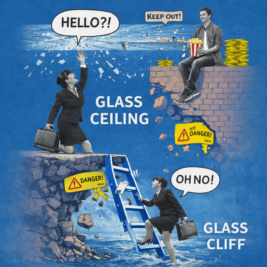 Ryan og Haslam (2005) viste, at kvinder oftere blev udnævnt til ledelsesroller i virksomheder, når resultaterne i forvejen var dårlige. Det er glass cliff: kvinder slipper ikke bare sjældnere ind – de får også oftere adgang til toppen i situationer, hvor risikoen for nederlag er højere. Det betyder, at selve “gennembruddet” kan være konstrueret som en fælde. Fænomenet er siden blevet dokumenteret i flere sammenhænge:
