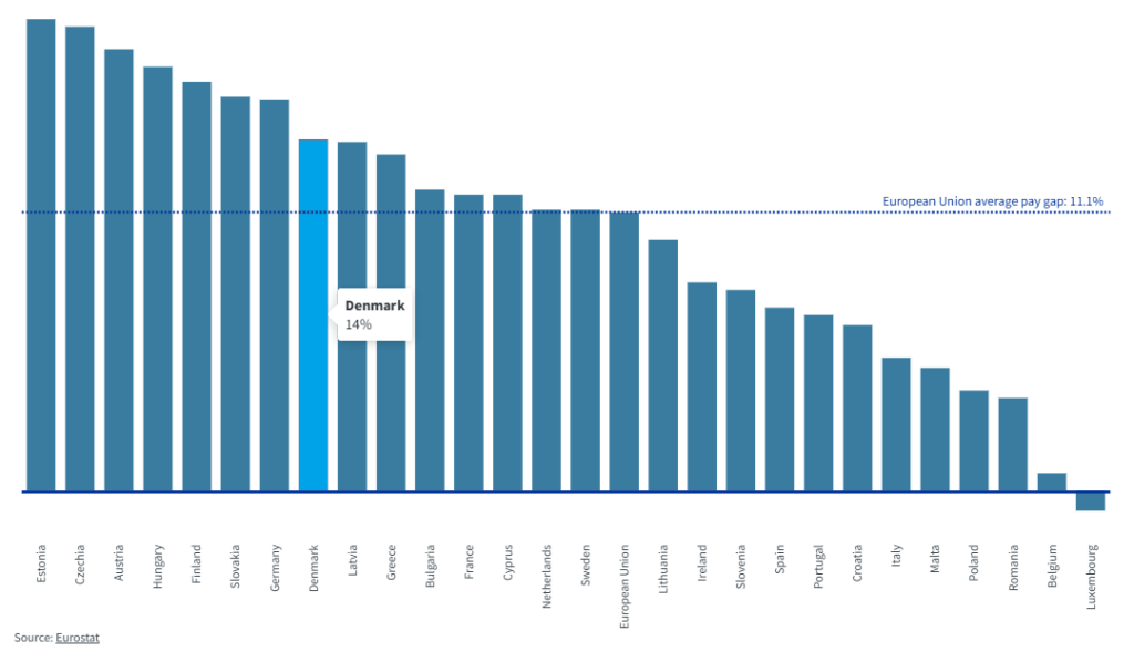 I Danmark tjente kvinder i gennemsnit 12,9 % mindre end mænd i 2024 (dst.dk), og Eurostat har tidligere vist et løngab på omkring 14 % i Danmark (målt som det ujusterede løngab), hvilket peger på en vedvarende strukturel forskel over tid.