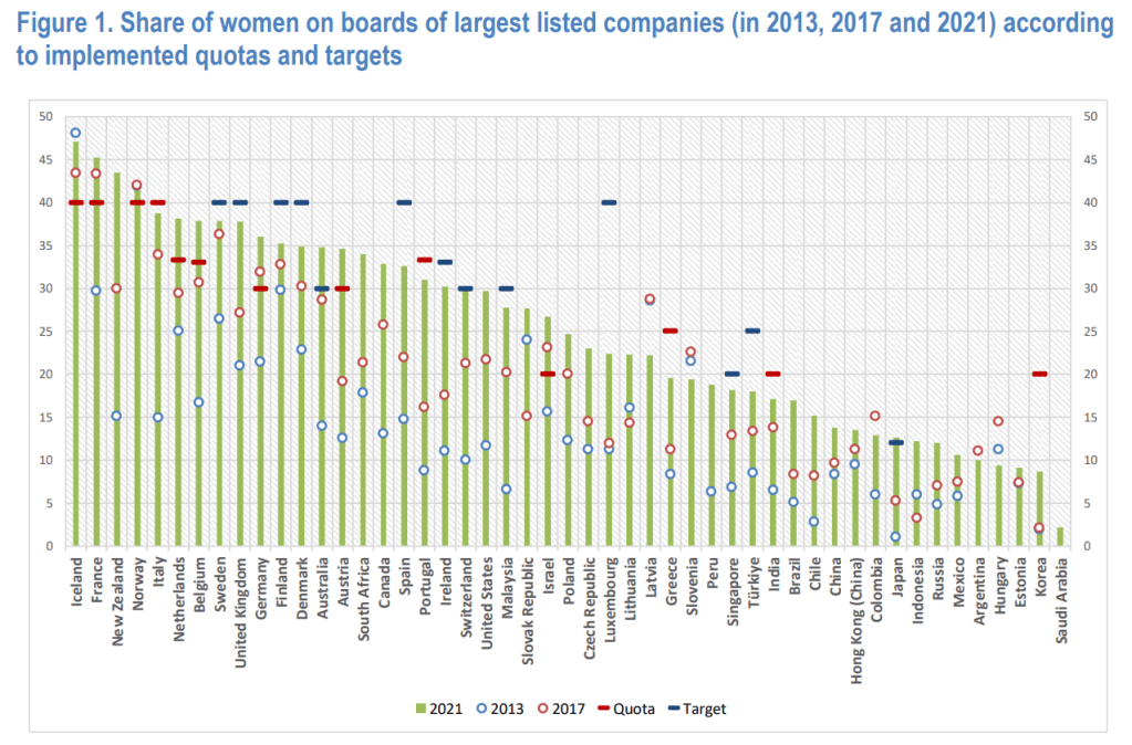 Figur: Andel kvinder i bestyrelser i de største børsnoterede virksomheder (OECD) Selv i verdens største og mest magtfulde virksomheder er kvinder markant underrepræsenterede i bestyrelser. Figuren viser ikke bare variation mellem lande, men et gennemgående mønster: Jo tættere man kommer på økonomisk magt og beslutningskraft, desto færre kvinder er der. De højeste andele findes i lande, hvor kvoter eller politiske mål er indført, hvilket understreger, at forandring ikke sker spontant, men kræver strukturel regulering.
